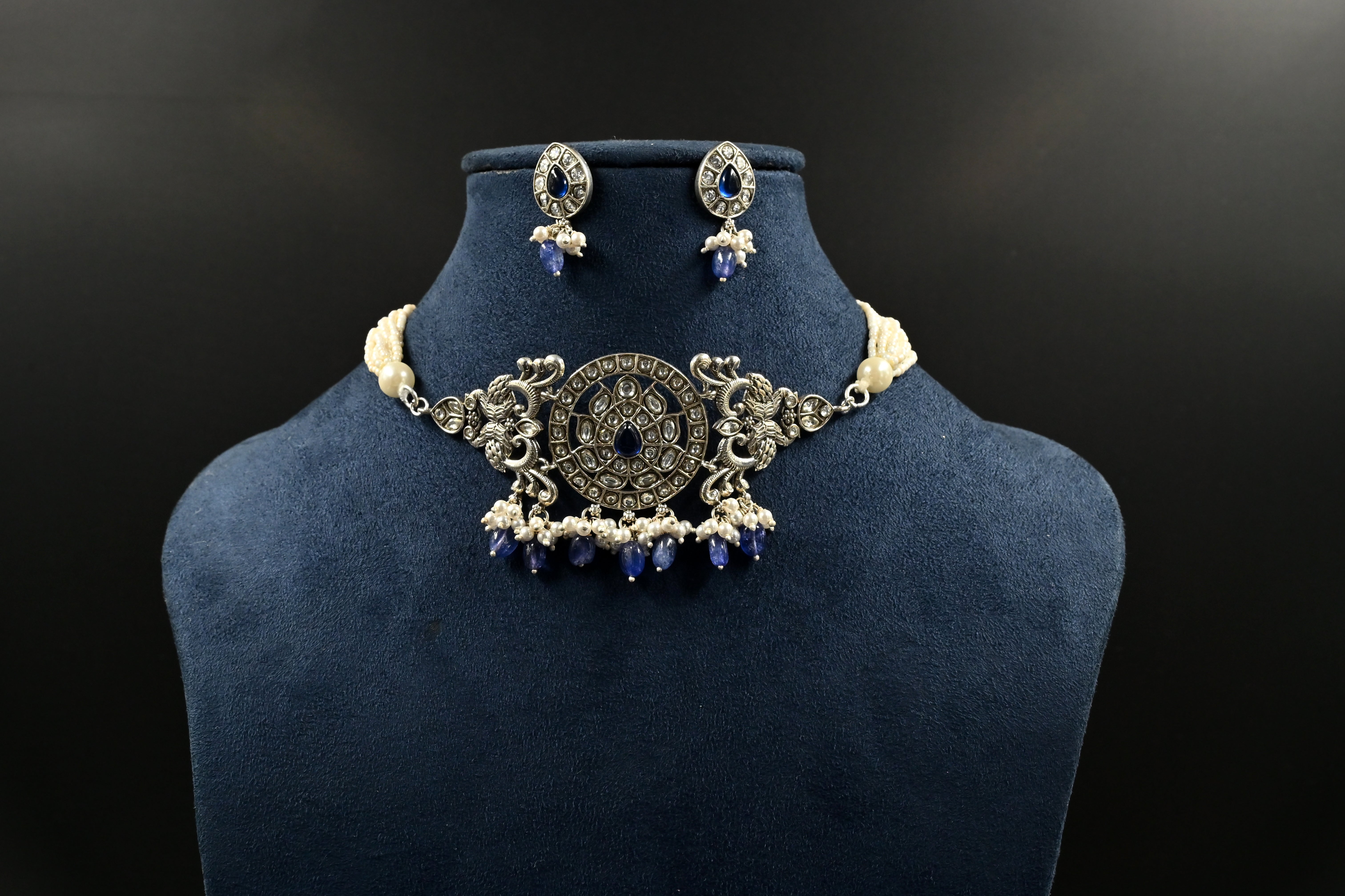 Channel royal elegance with the Sultana Sapphire Necklace Set, exquisitely crafted in 925 Silver. Rich, deep blue sapphire stones adorn this set with a majestic glow that evokes the grace and luxury of a sultan's court. Whether for a wedding, festive event, or a grand evening out, this set blends tradition with modern regal charm.
